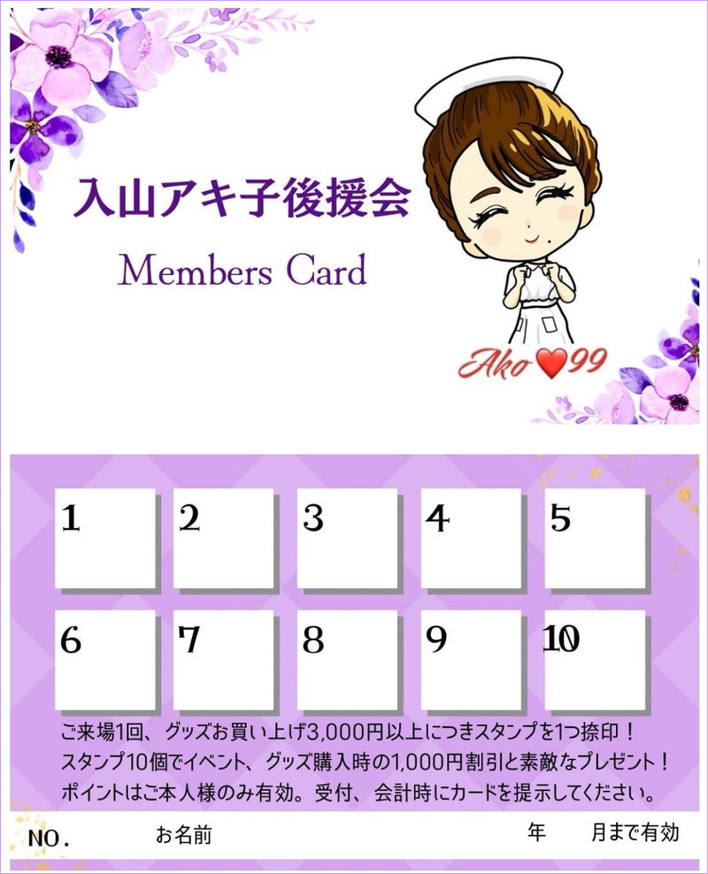 郵送される通信物、入山アキ子からの手書きBIRTHDAYカードをご希望の方は「入山アキ子後援会」にご入会ください。